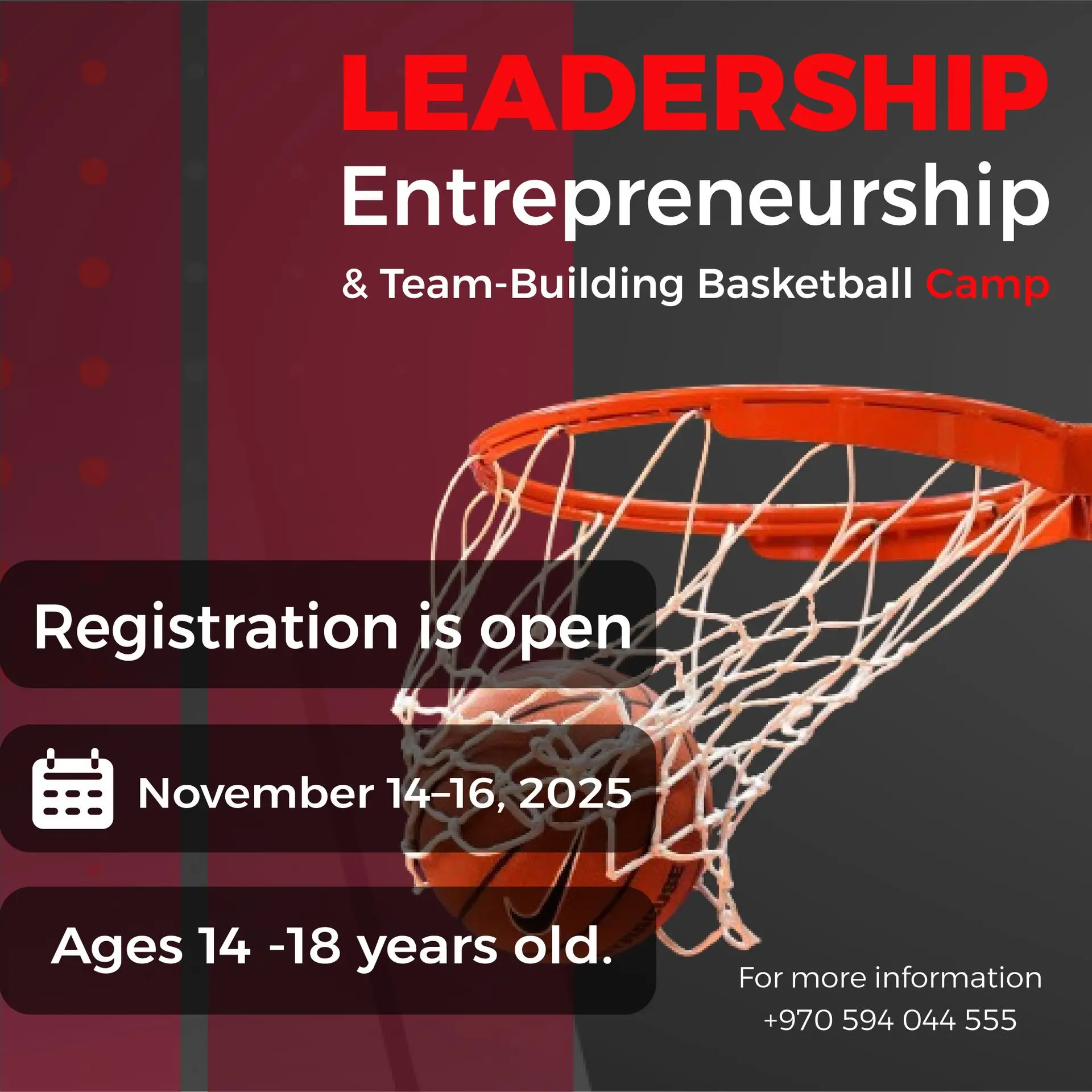 The Sports Camp is designed as a three-day program, scheduled for November 14–16, 2025, targeting 25-30 male and female basketball players ages 14 -18 years old. The camp is designed to include a balanced mix of leadership, teamwork, entrepreneurship, and basketball-focused activities.